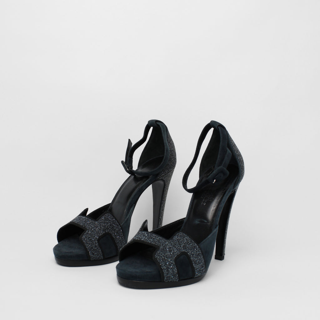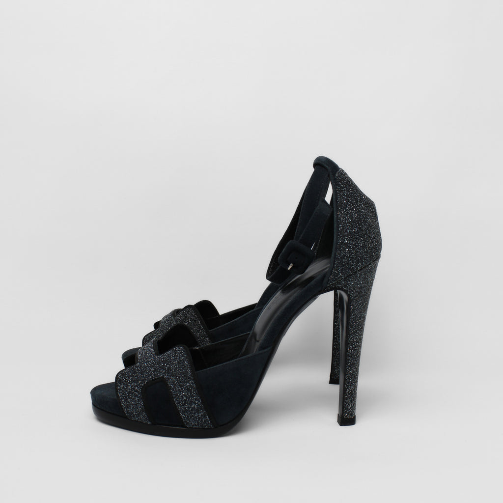 Hermès ankle strap sandals in navy glitter, featuring a refined silhouette with sparkling detail for a chic, standout finish. Ideal for elevating evening and special occasion looks.