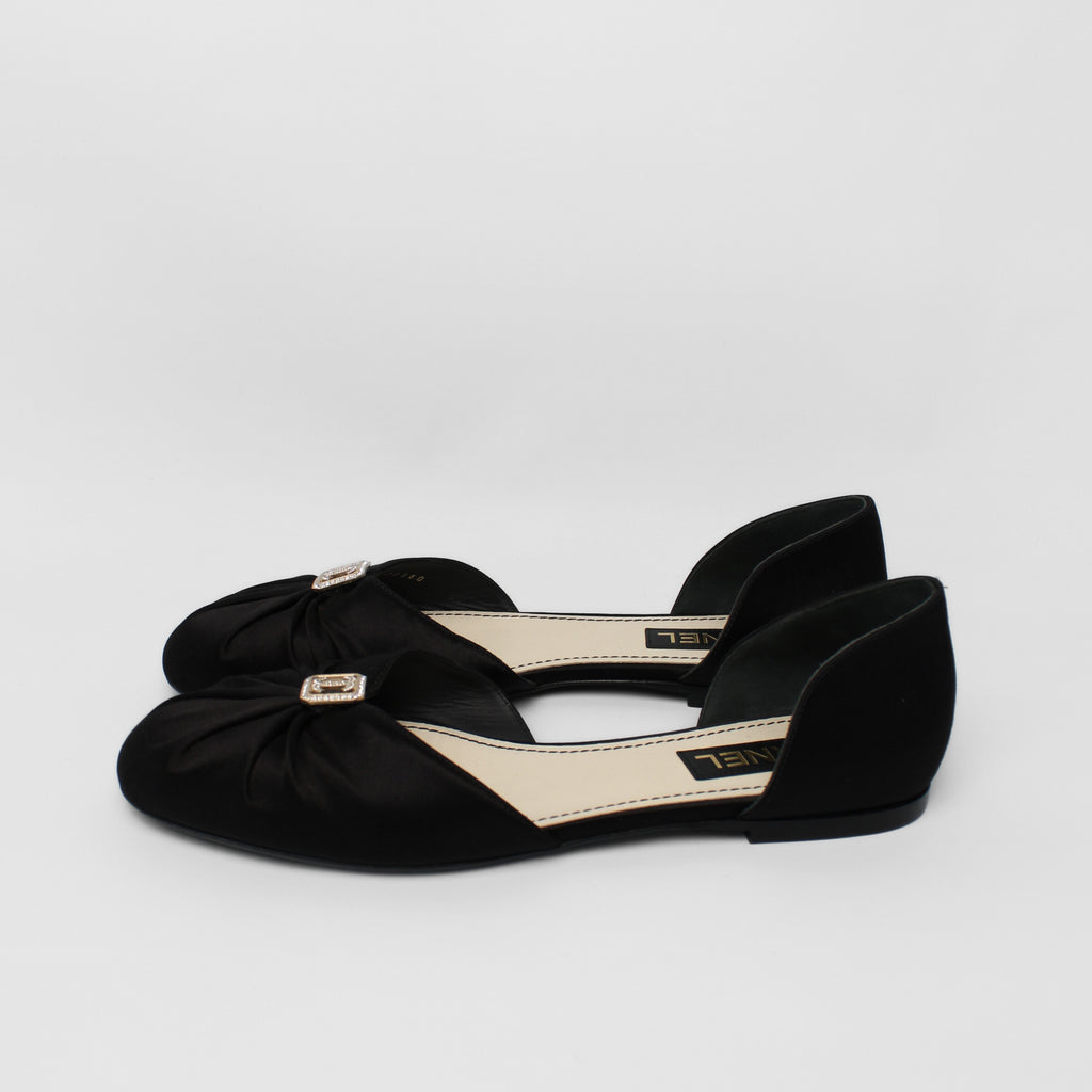Chanel ballet flats in black satin with crystal logo Elegant black satin ballet flats featuring Chanel’s iconic crystal logo, combining timeless sophistication with subtle, statement-making detail. Perfect for both polished daywear and evening looks.